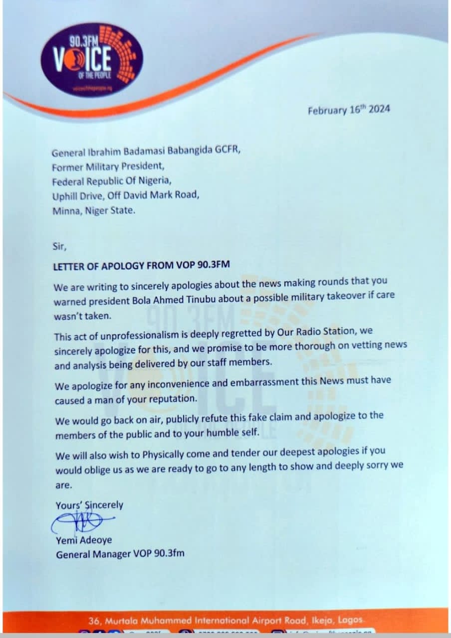 The management of VOP 90.3fm has apologised to former president Ibrahim Babangida over an allegation that he issued a warning to President Bola Tinubu about a possible military takeover.