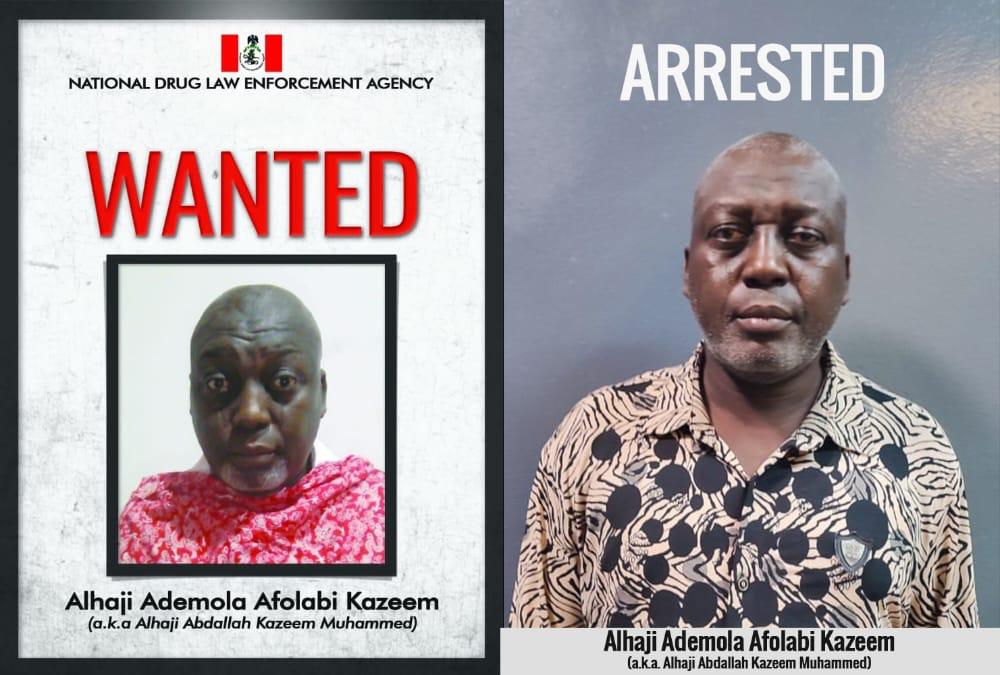 Ten days after he was declared wanted, operatives of the National Drug Law Enforcement Agency, NDLEA, have arrested fleeing Lagos socialite and owner of Adekaz Hotels, Alhaji Ademola Afolabi Kazeem (a.k.a Alhaji Abdallah Kazeem Muhammed) over offences bordering on exportation and trafficking of illicit drugs as well as money laundering.