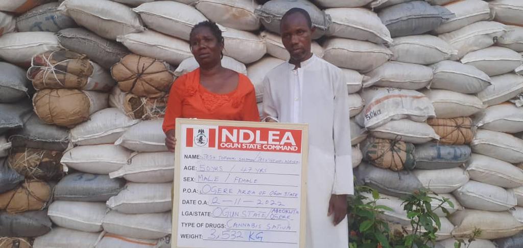 Operatives in Ogun state in the early hours of Saturday 12th Nov raided a warehouse at Ogere area of Ikene LGA where they seized 273 jumbo bags of cannabis sativa weighing 3,533 kilograms (3.533tons) from a couple, Mr. and Mrs. Jesutofunmi Solomon. This came on the heels of the seizure of 176kgs of C/S at Ogere trailer park on Wednesday 9th Nov and the destruction of 15 hectares of cannabis plantation in Gbamgbam area of the state.