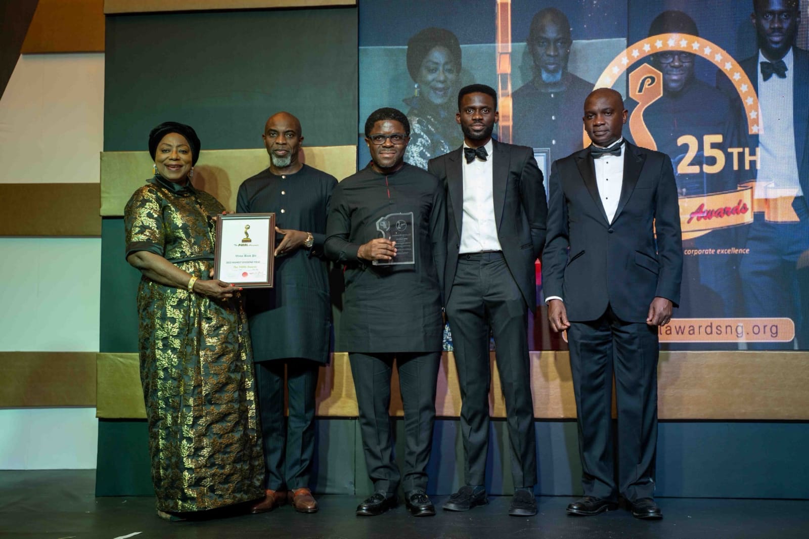 L to R: Chairman, Lasaco Assurance Plc & Former Board Member, PEARL Awards Nigeria., Chief(Mrs) Teju Philips; Deputy Managing Director, Wema Bank, Moruf Oseni; Chief Financial Officer, Wema Bank, Tunde Mabawonku; Reputation Management Officer, Wema Bank, Olumide Yomi-Omolayo; CEO, NASD OTC Securities Exchange Limited, Mr. Longe Eguarekhide, presenting the Pearl Award to Wema Bank as the winner of the 2022 Highest Dividend Yield at Eko Hotel and Suites last weekend.