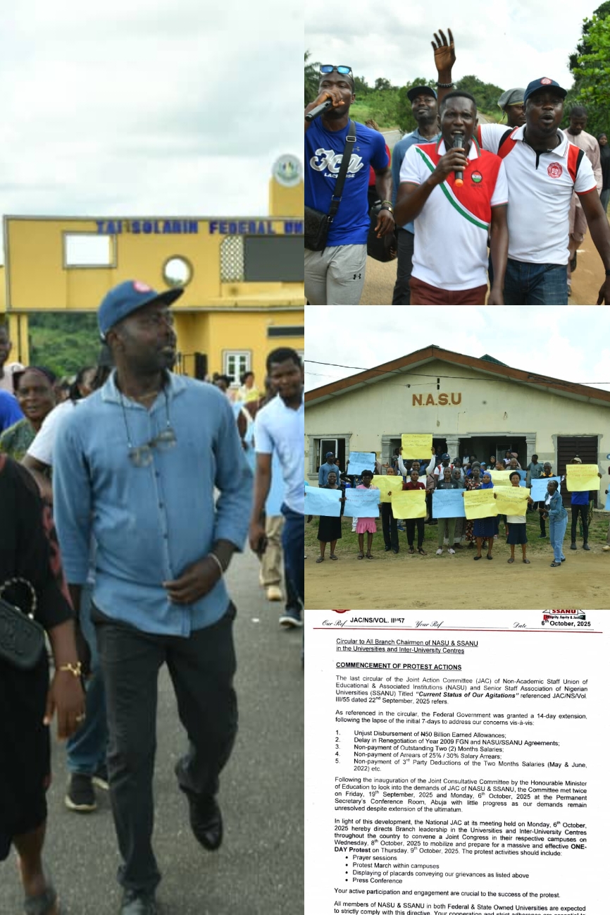 The Non-Academic Staff Union (NASU) of Tai Solarin University of Education (TASUED), Ijagun, has explained why it joined other university workers across the country in the nationwide protest declared by the Joint Action Committee (JAC) of NASU and SSANU, following unresolved disputes with the Federal Government over unpaid entitlements and other welfare issues.