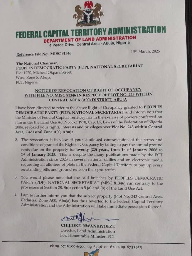 According to the letter, the decision was based on the party’s failure to pay annual ground rents on the property for 20 years, from January 1, 2006, to January 1, 2025. The FCT Administration had previously issued multiple public notices in national newspapers and electronic media since 2023, urging all landowners in the capital city to clear their outstanding payments.